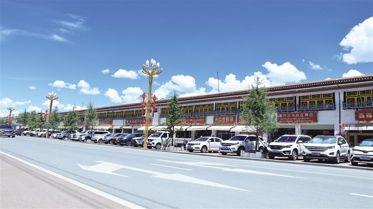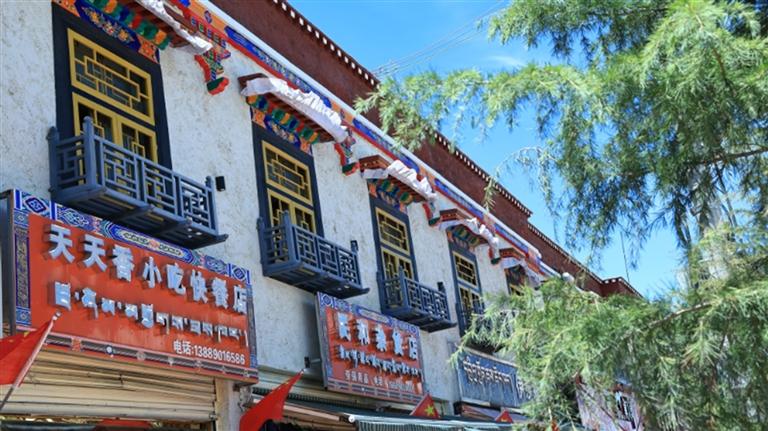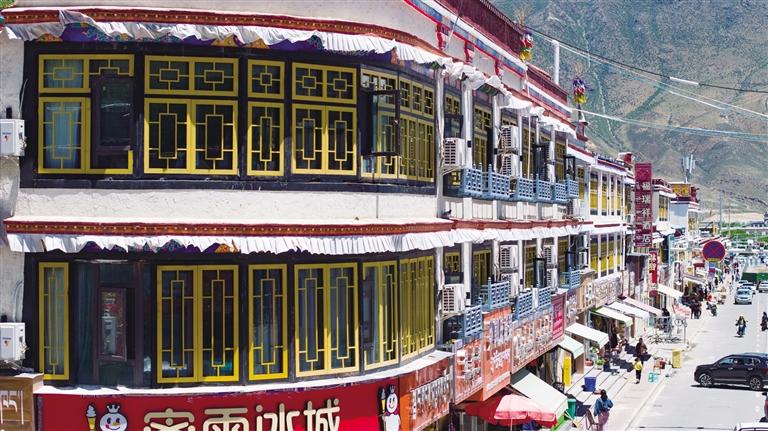 值得關(guān)注的是,此次修復(fù)及新建的商鋪外立面特意采用傳統(tǒng)藏式繪畫(huà)工藝,選用新藏式風(fēng)格,旨在弘揚(yáng)獨(dú)特的當(dāng)?shù)匚幕蛊湓诂F(xiàn)代城市中展現(xiàn)新活力。通過(guò)外立面裝飾改造形成統(tǒng)一風(fēng)格后,老舊街區(qū)的藏式特色更加凸顯。