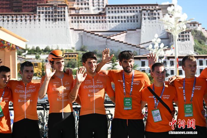圖為開幕式上巴斯克電信職業(yè)隊(duì)隊(duì)員在布達(dá)拉宮廣場(chǎng)合影留念。貢嘎來(lái)松 攝