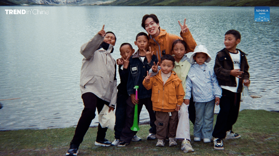在薩普雪山下,記者與一群藏族孩童。新華社發(fā)