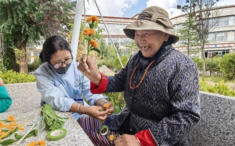 近日,記者走進拉薩市社會福利院的大門,一陣歡快的笑聲便撲面而來。循聲望去,涼亭下,幾位老人正圍坐在一起,手中拿著彩色毛線,在編織老師的耐心指導下專注地編織著花朵?!翱矗业幕ㄗ龊昧?!”卓嘎老人高高舉起剛剛完成的一朵黃色小花,孩子般興奮地向同伴們展示。她的手指雖有些顫抖,但眼神中卻掩飾不住自豪。另外一邊,幾位老人正在院子里悠閑地散步,一位護工正小心翼翼地攙扶著行動不便的老人,輕聲問道:“今天腿還疼嗎?要不要去理療室做做按摩?”關(guān)切之情溢于言表。