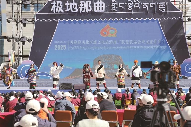 活動伊始,先后播放了昌都、那曲、阿里及相關(guān)縣(區(qū))的文化旅游宣傳片。緊接著,昌都市與那曲市相關(guān)人員依次登臺,對本地的文化旅游資源進(jìn)行詳細(xì)推介。昌都市重點(diǎn)展示了茶馬古道、三江并流以及芒康鹽井等獨(dú)特資源;那曲市則聚焦于羌塘草原、納木錯圣象天門、薩普景區(qū)以及格薩爾史詩等核心資源,充分彰顯了“極地那曲”的無限魅力。緊接著,索縣、申扎、尼瑪三縣分別登臺,從微觀視角推介縣域特色——索縣的贊丹雪、穹雄溝,申扎縣的色林錯,尼瑪縣的當(dāng)惹雍錯等人文風(fēng)光,進(jìn)一步豐富了藏西北文旅的內(nèi)涵。