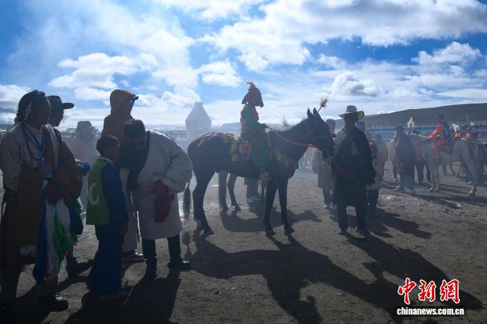 9月7日,在西藏自治區(qū)那曲市格薩爾賽馬場,一年一度的恰青賽馬節(jié)迎來傳統(tǒng)大跑決賽。此次比賽賽程10公里,吸引了來自西藏各地市的150名騎手參賽。那曲恰青賽馬節(jié)歷史悠久,已被列入中國國家級非物質(zhì)文化遺產(chǎn)代表性項目名錄,傳統(tǒng)大跑決賽作為其中的重頭戲,不僅是速度與激情的碰撞,更是那曲傳統(tǒng)文化的精彩展示。圖為賽前馬主跟騎手交流。中新社記者 貢嘎來松 攝
