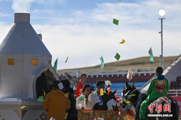 圖為恰青賽馬節(jié)傳統(tǒng)大跑決賽前參賽選手拋灑“隆達”(風馬旗,藏族民眾的一種祈福方式)。中新社記者 貢嘎來松 攝