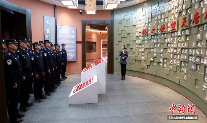 在大唐天竺使之銘陳列館,一塊承載千年歷史的摩崖石刻成為民警們的“第一課”。該陳列館以石刻為核心,通過珍貴文物、歷史文獻與場景復(fù)原,系統(tǒng)呈現(xiàn)了古代邊關(guān)在中外文明互鑒、邊疆治理中的關(guān)鍵作用。民警們仔細(xì)觀看展品,深刻感悟先輩開拓邊關(guān)、守護疆土的堅韌擔(dān)當(dāng)。