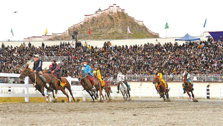 “達瑪”藏語意為“跑馬射箭”。每年的達瑪節(jié),賽馬都會吸引十里八鄉(xiāng)的人們前來觀賽。賽馬場上人頭攢動,隨著發(fā)令聲響,一匹匹駿馬如離弦之箭沖出起跑線,騎手俯身貼在馬背上,揚鞭馳騁,你追我趕,奮勇爭先。觀眾席上,人們隨著比賽節(jié)奏,時而激動,時而安靜,時而歡呼,時而嘆息。藏族阿媽次仁卓嘎難掩激動,她告訴記者,幾乎每年都會和家人來看賽馬。賽場上,選手們堅韌不拔、昂揚向上的精神風貌讓人動容,也激勵著一代又一代英雄城兒女為祖國發(fā)展繁榮而不懈奮斗。