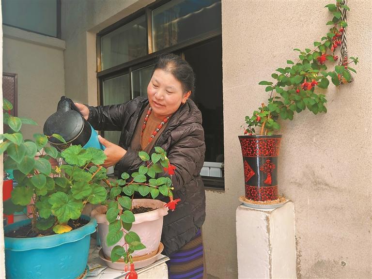 圖為那曲市林廓社區(qū)居民斯曲在自家陽(yáng)光房里整理花卉。記者 萬靖 攝