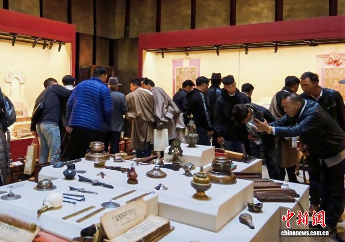 圖為觀眾正在欣賞展覽中的藏品。西藏唐卡藝術(shù)博物館供圖