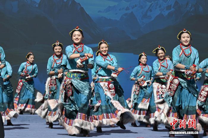 圖為阿里地區(qū)改則縣藝術(shù)團(tuán)表演舞蹈《歡舞幸?!じ膭t情》。中新社記者 貢嘎來松 攝