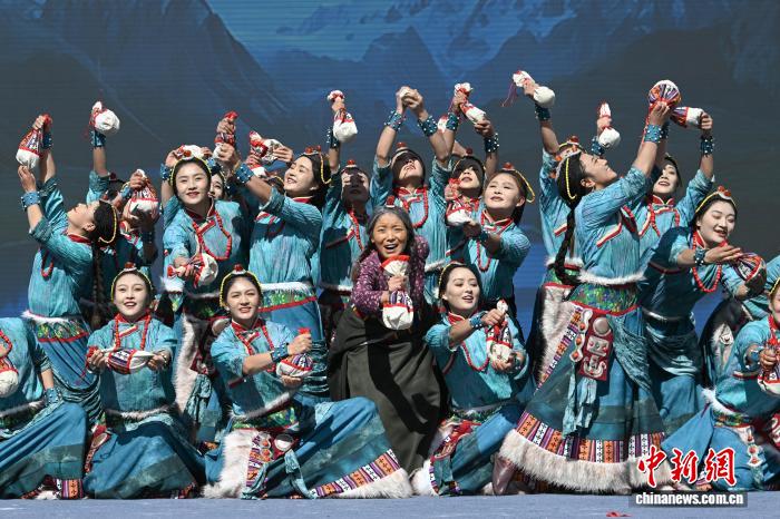 圖為昌都市邊壩縣藝術(shù)團(tuán)表演女子群舞《糌粑揉出幸福情》。中新社記者 貢嘎來松 攝