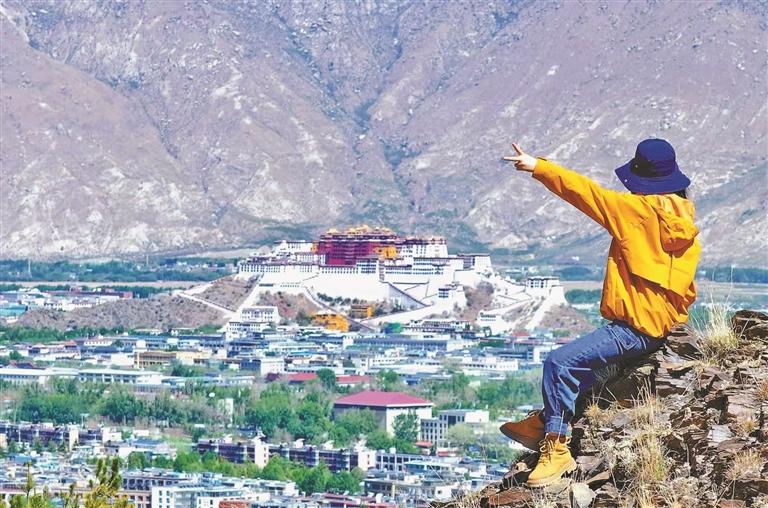 游客以布達拉宮為背景參與創(chuàng)意旅拍。記者 鄭常容 攝