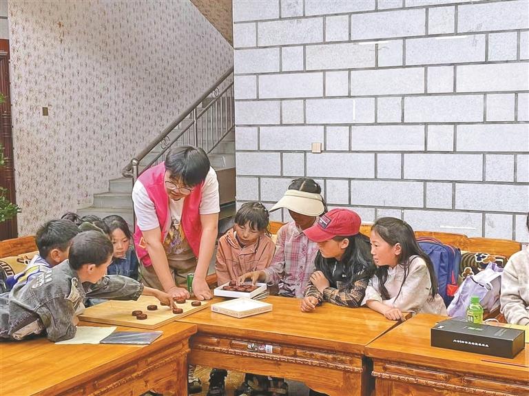 蔡公堂街道公堂社區(qū)開展的“小太陽(yáng)”輔導(dǎo)班上,志愿者與孩子們下棋。文/圖 記者 劉斯宇 通訊員 張銀鵬