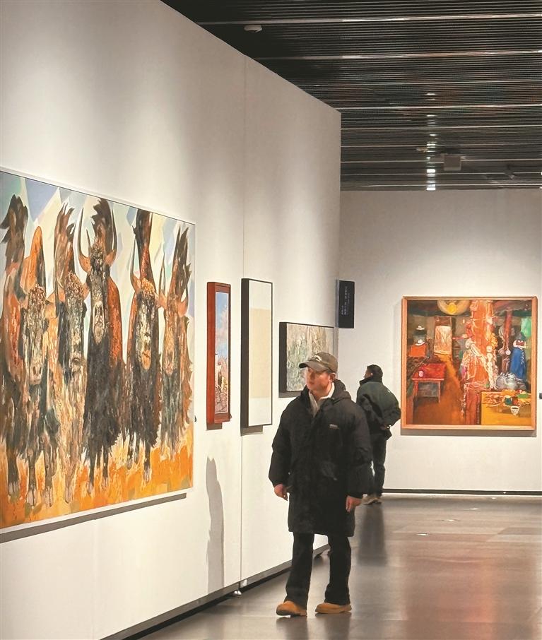 圖為參觀者在油畫前駐足觀賞。