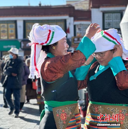 12月4日,拉薩大昭寺前信眾整理著裝拍照留念。謝牧 攝