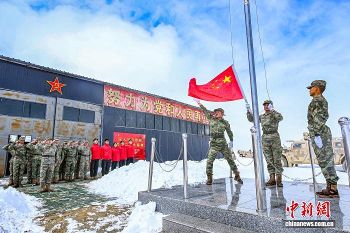 “大國邊疆”育人工程實踐團成員赴西藏日喀則市開展思政調(diào)研,走進“高原戍邊模范營”哨所,與官兵共同舉行升旗儀式。(中國人民大學供圖)