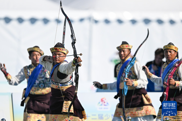 2024年11月27日,第十二屆全國少數(shù)民族傳統(tǒng)體育運動會表演項目中,西藏隊選手表演《響箭》。新華社記者 孫凡越 攝