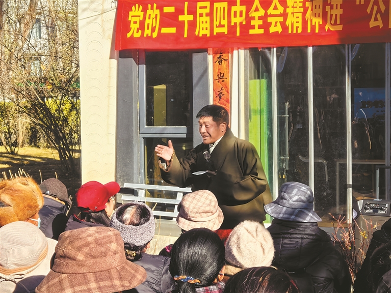 宗角祿康公園里,龍王潭水面結(jié)了一層薄冰,幾只斑頭雁縮著脖子在未結(jié)冰的區(qū)域游弋,遠(yuǎn)處的布達(dá)拉宮在枯樹(shù)的枝丫間露出巍峨的輪廓,湛藍(lán)的湖水把白墻紅頂?shù)膶m殿映得愈發(fā)莊嚴(yán)。公園一角,黨的二十屆四中全會(huì)精神宣講活動(dòng)正在這里舉辦。身著藏裝的拉薩市城關(guān)區(qū)金牌宣講員丹增,用通俗易懂的語(yǔ)言講解道:“鄉(xiāng)村振興的政策會(huì)讓咱們的日子更紅火,孩子上學(xué)有保障,老人看病更方便!”他的聲音洪亮、語(yǔ)氣懇切,群眾聽(tīng)得格外認(rèn)真,時(shí)不時(shí)還跟身邊的人低聲交流:“政策越來(lái)越好,我們的生活肯定會(huì)更有奔頭?!睅孜淮髦窠q帽的老人,眼神里滿(mǎn)是專(zhuān)注;年輕的姑娘拿著手機(jī)記錄宣講內(nèi)容,還不時(shí)在微信群里分享,讓沒(méi)能到場(chǎng)的朋友也能及時(shí)了解。冬日的陽(yáng)光灑在每個(gè)人的身上,讓這份政策宣講多了幾分溫暖的底色。