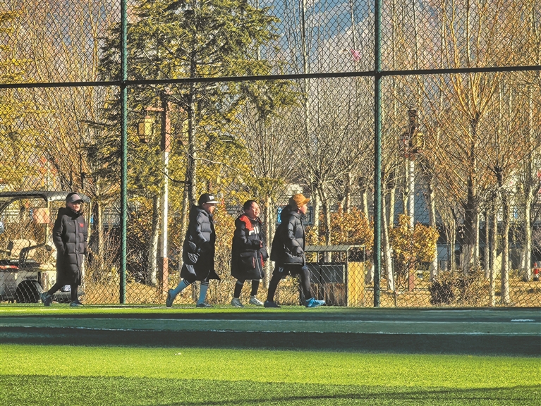 “我很喜歡踢足球!寒假里每天都來(lái)練球,跑起來(lái)就不冷了?!比蕬c抹了把額頭的薄汗,眼睛亮得像高原的太陽(yáng)。教練站在場(chǎng)邊,手里拿著戰(zhàn)術(shù)板,不時(shí)喊著指令:“注意跑位,傳球要快!”他的聲音在空曠的公園里回蕩,打破了冬日的寂靜。幾名隊(duì)員追逐著足球,球鞋與草皮摩擦的聲響、高亢的呼喊聲,讓這片足球場(chǎng)成了體育公園最熱鬧的地方。
