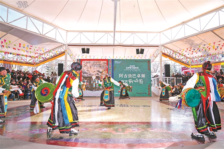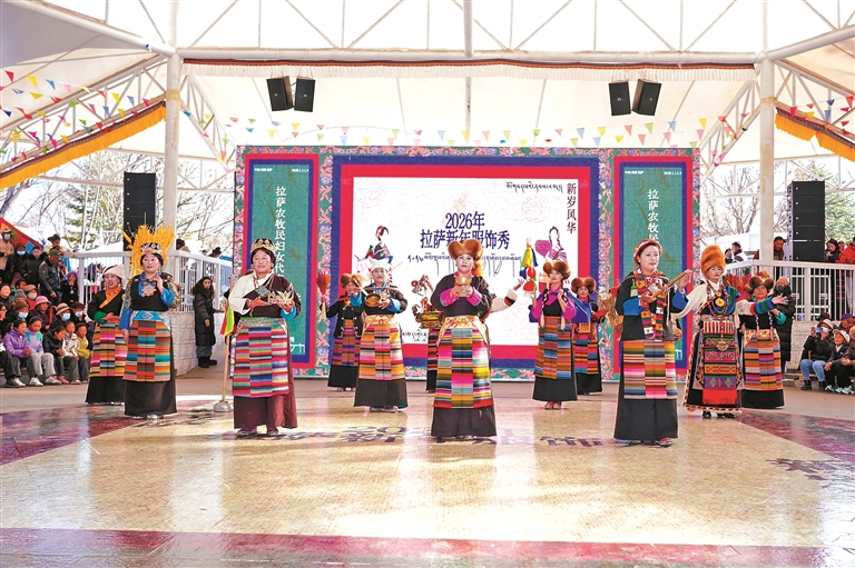 圖為2026拉薩新年服飾秀拉薩農(nóng)牧民婦女代表“村T秀”宗角祿康公園活動(dòng)現(xiàn)場(chǎng)。圖/文 記者 格桑倫珠