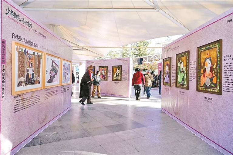 圖為市民游客在宗角祿康公園駐足觀賞“旖旎雪域”主題班珠丹塔服飾作品與插畫(huà)藝術(shù)展。