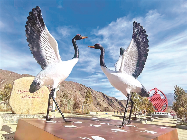 圖為哲蚌寺民族團結主題公園內的拉薩市鳥黑頸鶴雕塑。