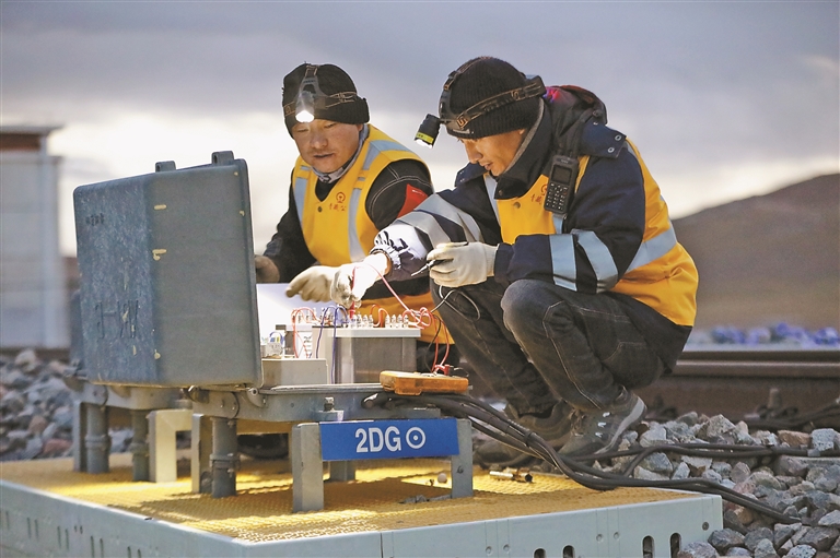 圖為近日,中國鐵路青藏集團有限公司拉薩基礎(chǔ)設(shè)施段那曲信號車間扎加藏布信號工區(qū)職工在對信號機進行電氣特性測試及數(shù)據(jù)記錄。記者 旦增蘭澤 通訊員 拉巴次仁 攝