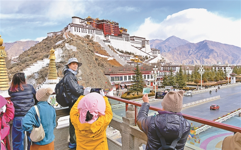 游客與布達(dá)拉宮合影。記者 王敏 唐斌 攝