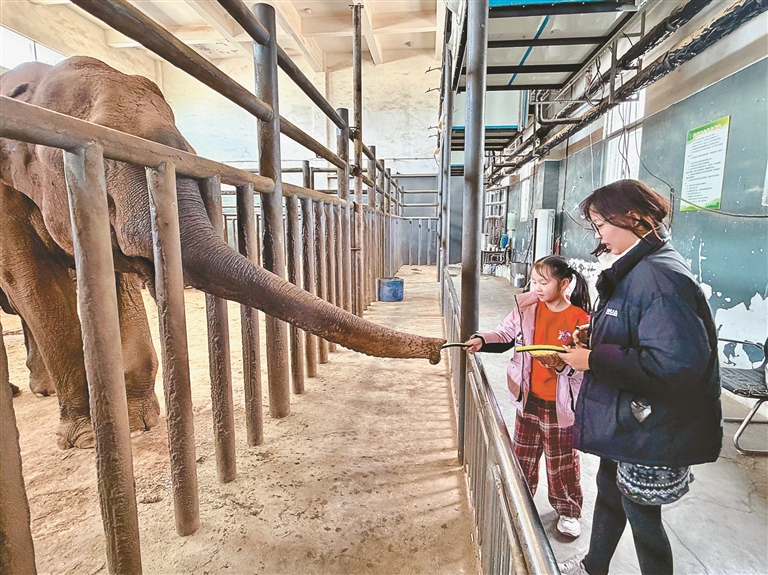 西藏野生動物保護(hù)園內(nèi),游客與大象互動。記者 王敏 攝