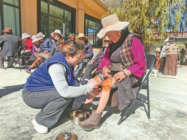 圖為工作人員為老人提供藏式理療服務。圖/文 記者 央金