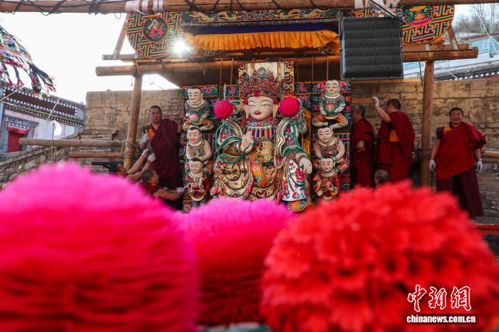 3月3日,青海省西寧市湟中區(qū)塔爾寺僧人將上花院的酥油花主尊——文殊菩薩固定在花架上。馬銘言 攝