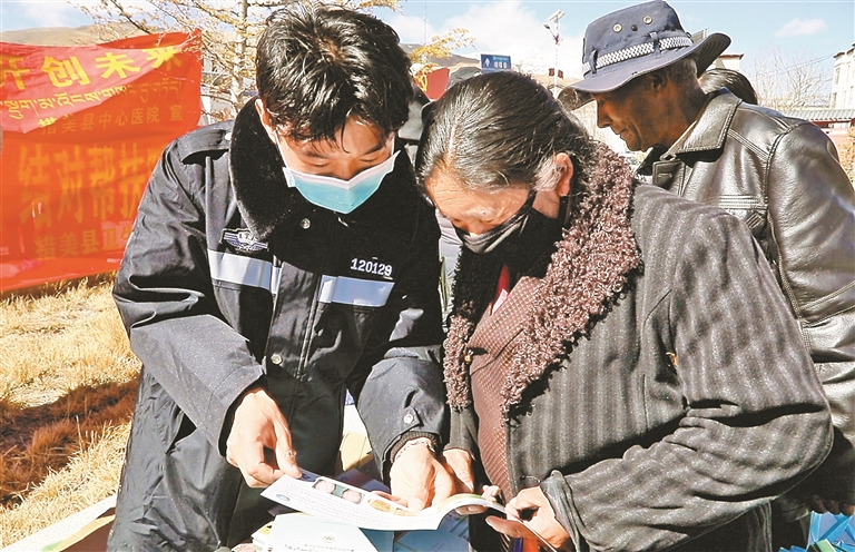 措美縣紀(jì)念西藏百萬農(nóng)奴解放67周年活動(dòng)中,黨員干部為群眾發(fā)放宣傳手冊(cè)。
