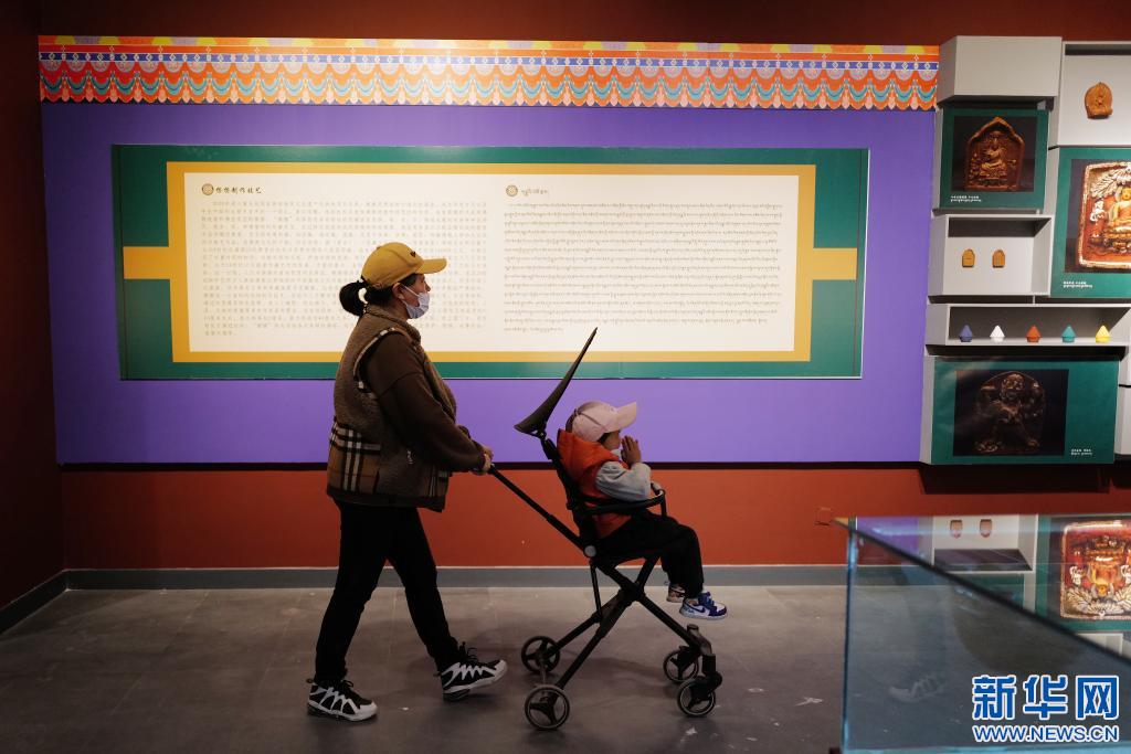 4月3日,一名小女孩在西藏牦牛博物館觀看拉薩市非物質(zhì)文化遺產(chǎn)代表性項目展。新華社記者 孫瑞博 攝