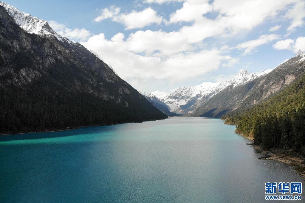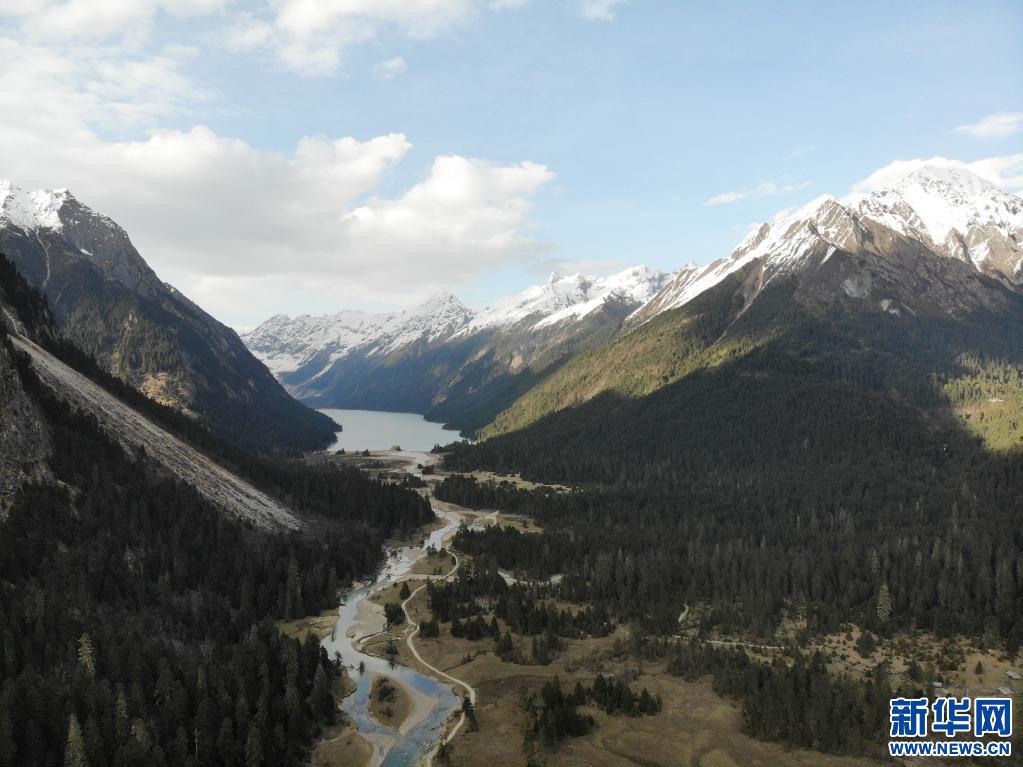 這是5月1日拍攝的雪山間的新措和森林、牧場(chǎng)(無(wú)人機(jī)照片)。新華社記者 孫瑞博 攝