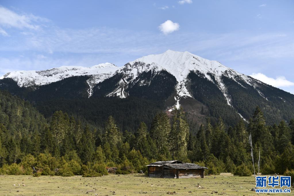 這是5月1日在西藏林芝市工布江達(dá)縣拍攝的新措旁桑通牧場(chǎng)上的木屋。新華社記者 孫瑞博 攝