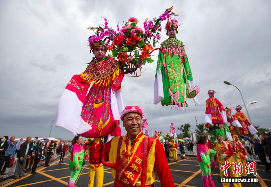 9月23日,山西晉中,當(dāng)?shù)孛癖姳硌萆缁饝c祝豐收節(jié)。當(dāng)日,2021年中國(guó)農(nóng)民豐收節(jié)山西慶?;顒?dòng)暨第七屆中國(guó)(山西)特色農(nóng)產(chǎn)品交易博覽會(huì)在晉中國(guó)家農(nóng)高區(qū)(山西省農(nóng)產(chǎn)品國(guó)際交易中心)開(kāi)幕。 中新社記者 張?jiān)?攝