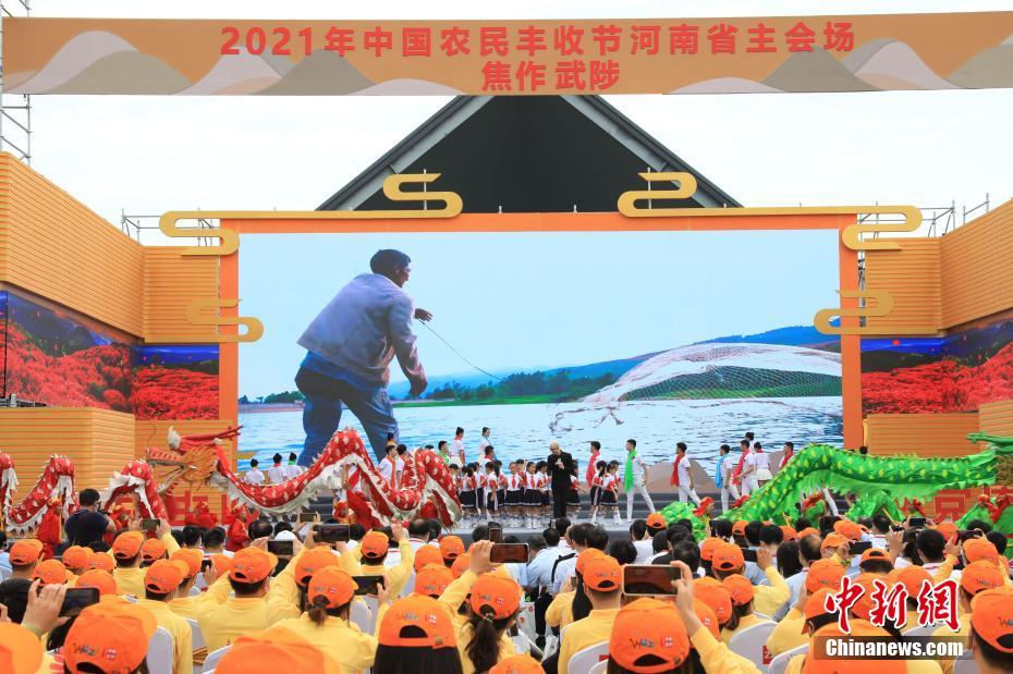 9月23日,2021中國(guó)農(nóng)民豐收節(jié)河南省主會(huì)場(chǎng)在焦作市武陟縣嘉應(yīng)觀啟幕?;顒?dòng)現(xiàn)場(chǎng),隨處可見(jiàn)“豐收”符號(hào),各類(lèi)農(nóng)副產(chǎn)品琳瑯滿(mǎn)目,船上漁民捧著魚(yú)喜笑顏開(kāi)。圖為2021中國(guó)農(nóng)民豐收節(jié)河南省主會(huì)場(chǎng)。闞力 攝