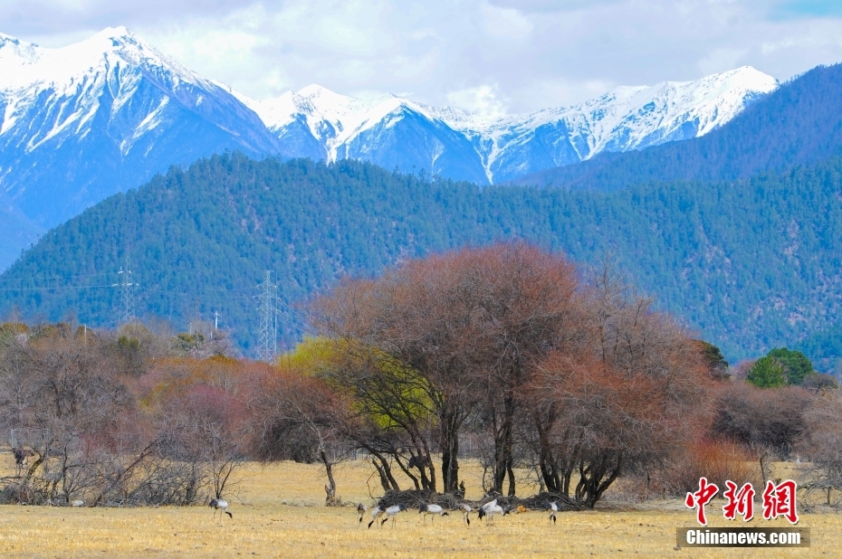 3月30日,在西藏林芝市巴宜區(qū)更章門巴民族鄉(xiāng),黑頸鶴與周邊的村莊、桃花、雪山融為一體,成為春日里的一道靚麗的風(fēng)景線。圖為黑頸鶴在田間覓食嬉戲。