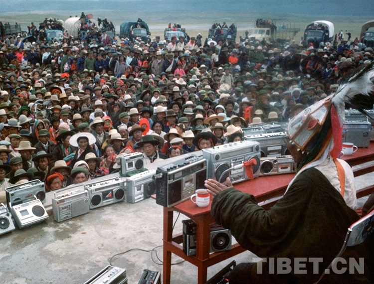 圖為說(shuō)唱藝人阿達(dá)在西藏那曲賽馬會(huì)上說(shuō)唱《格薩爾》的傳奇故事,臺(tái)上擺滿(mǎn)了牧民群眾的各式錄音機(jī)(才龍1985年前后攝)