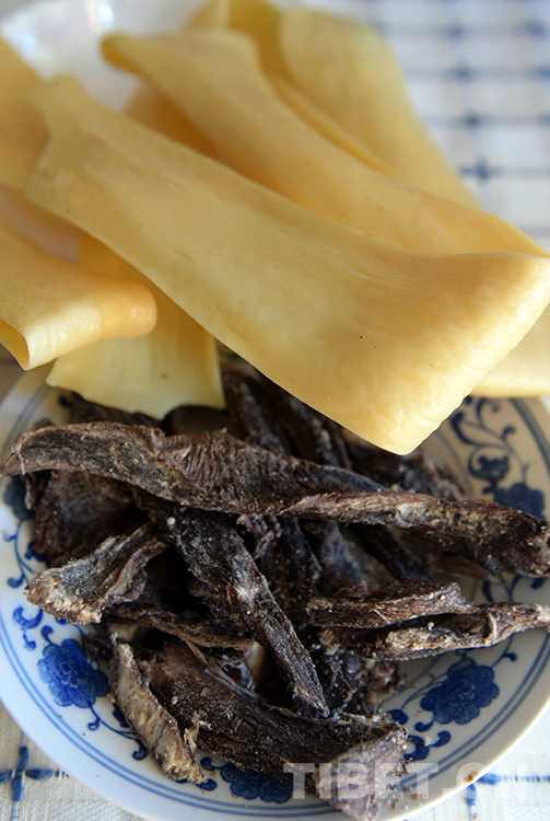 在藏北,常見的傳統(tǒng)風(fēng)干牦牛肉是不加任何佐料的,為的是讓肉保持最純粹的原味。每年進入11月底,藏北已是天寒地凍,牧民們先將新鮮牦牛肉切成條型狀,然后掛在通風(fēng)處晾起來,使之冰凍風(fēng)干,自然脫去水分。第二年3月后取下生吃即可,味道十分鮮美。