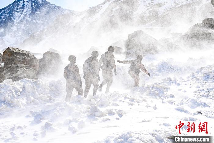 標(biāo)沙拉錯(cuò)哨點(diǎn)官兵艱難行走在風(fēng)雪中。 劉志丹 攝