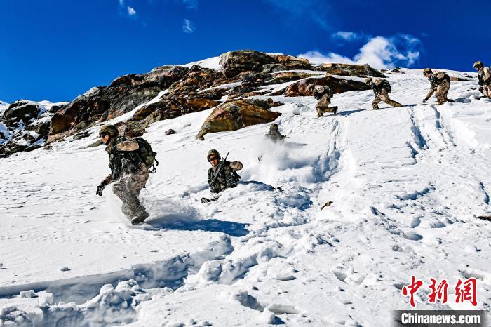 巡邏途中,官兵們順雪坡滑下,節(jié)省時(shí)間?!⊥踅?攝