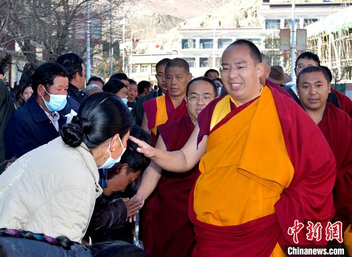 11月24日,班禪在白朗縣為信眾摸頂賜福。中新社記者 李林 攝