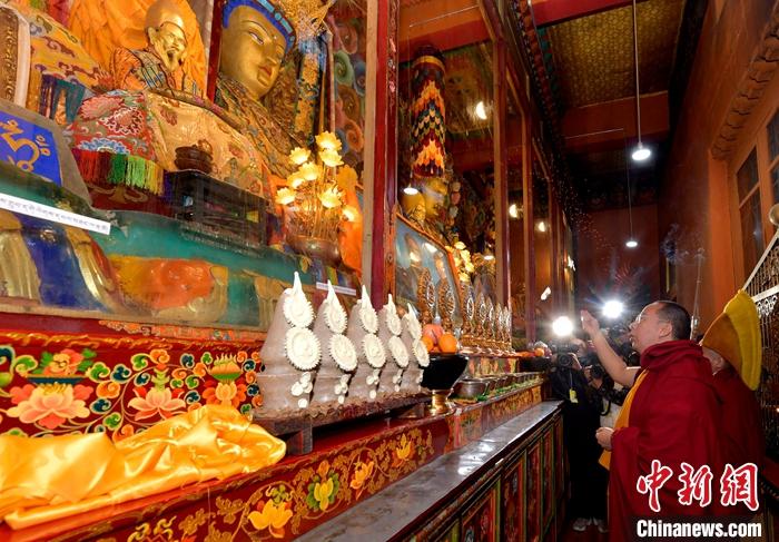 11月24日,班禪在白朗縣長美堅(jiān)寺禮佛。中新社記者 李林 攝