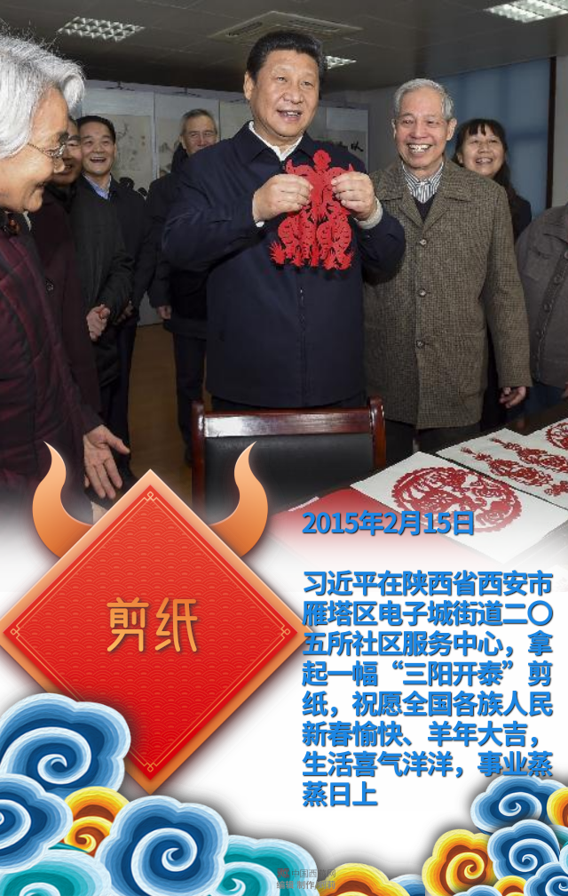 習(xí)近平在陜西省西安市雁塔區(qū)電子城街道二〇五所社區(qū)服務(wù)中心,拿起一幅“三陽開泰”剪紙,祝愿全國(guó)各族人民新春愉快、羊年大吉,生活喜氣洋洋,事業(yè)蒸蒸日上
