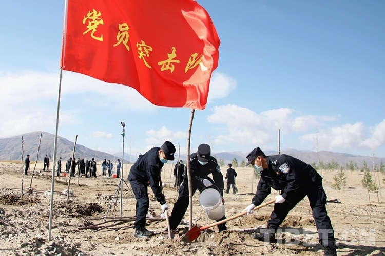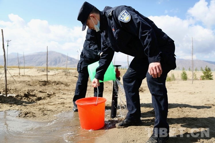 4月9日,民警們肩扛樹苗和鉆坑機(jī),手持鐵鍬和水桶,再次來(lái)到雅魯藏布江畔的沙漠地帶,開展義務(wù)植樹公益活動(dòng)。