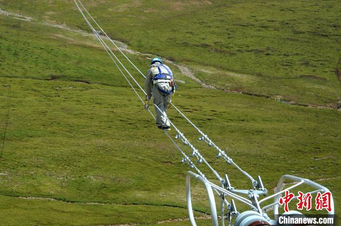 圖為世界海拔最高的330千伏輸變電工程玉樹聯(lián)網(wǎng)工程輸電線路穿越高山草原?;菸睦?攝