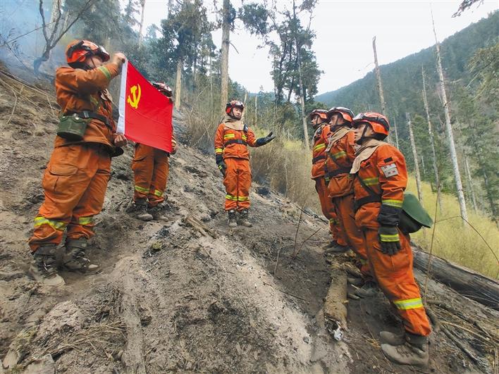 4月18日下午,米林縣森林消防中隊(duì)3名在火場(chǎng)中表現(xiàn)突出的消防隊(duì)員火線入黨。曾小鋒 記者 王珊 張猛 攝