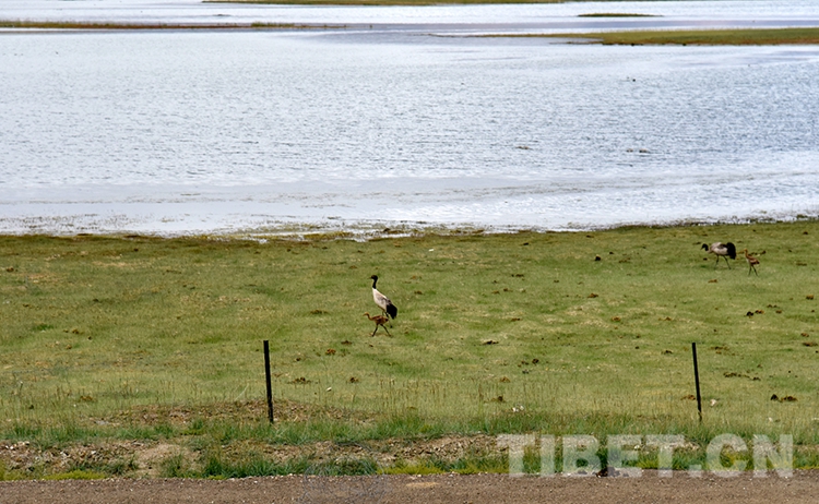 圖為黑頸鶴在班公湖岸悠閑漫步 攝影:王媛媛