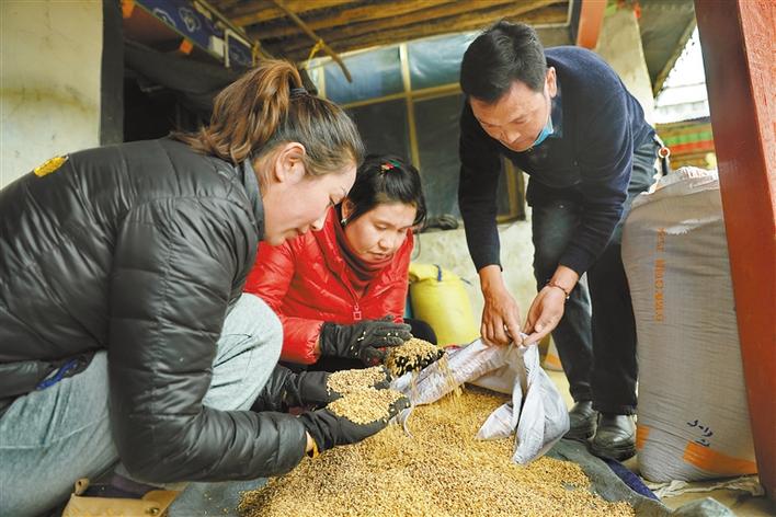 圖為墨竹工卡縣農(nóng)業(yè)農(nóng)村局(農(nóng)業(yè)技術(shù)推廣站)工作人員選購(gòu)青稞種子。洛??酥?唐斌 攝