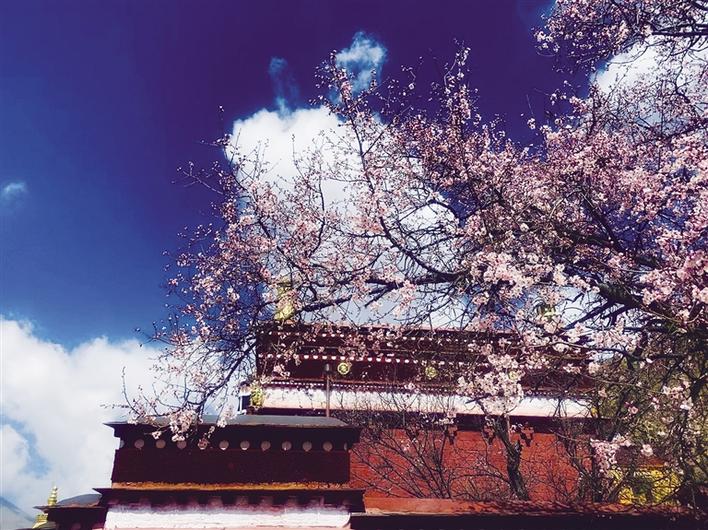 屬于帕崩崗的桃花,不像林芝桃花滿山遍野開,卻一如芬芳醉人的花草世界。粉色的桃花、藍(lán)色的天空、絢麗的藏裝、美麗的姑娘,在紅、黃廟墻的映襯下,在山坡上靜靜地開放,端然貞靜。