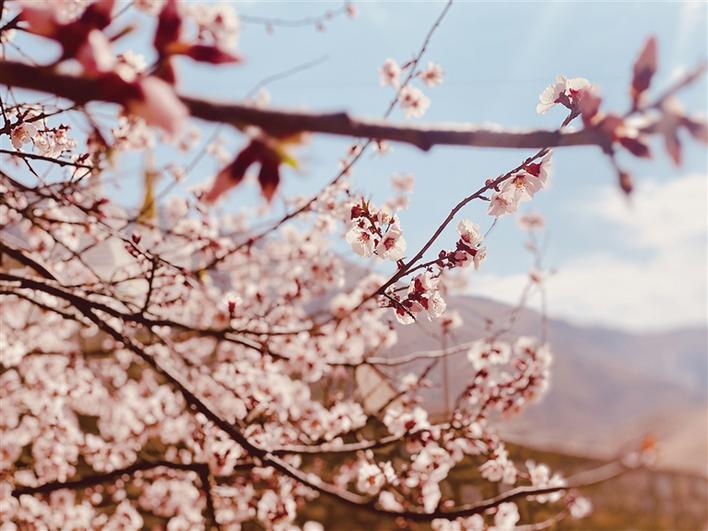 這里雖然沒有漫山遍野桃花次第盛開,但有花團錦簇、桃紅柳綠,幾棵桃樹,一陣春風(fēng)吹過,花瓣如雨。身著藏裝的姑娘,與桃花合影,共赴春天的約會,看上去頗有些妖嬈的味道。